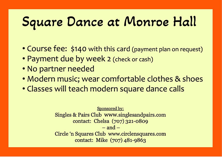 Together with our sister club at Monroe Hall, Singles & Pairs, Circle 'n Squares is co-sponsoring a course that will teach the full introductory set of square dance calls. Classes will be held during Singles & Pairs workshops on Wednesdays and Circle 'n Squares workshops on Thursdays both at Monroe Hall between 7:00pm and 8:30pm. The course is expected to take 14 weeks this fall.​